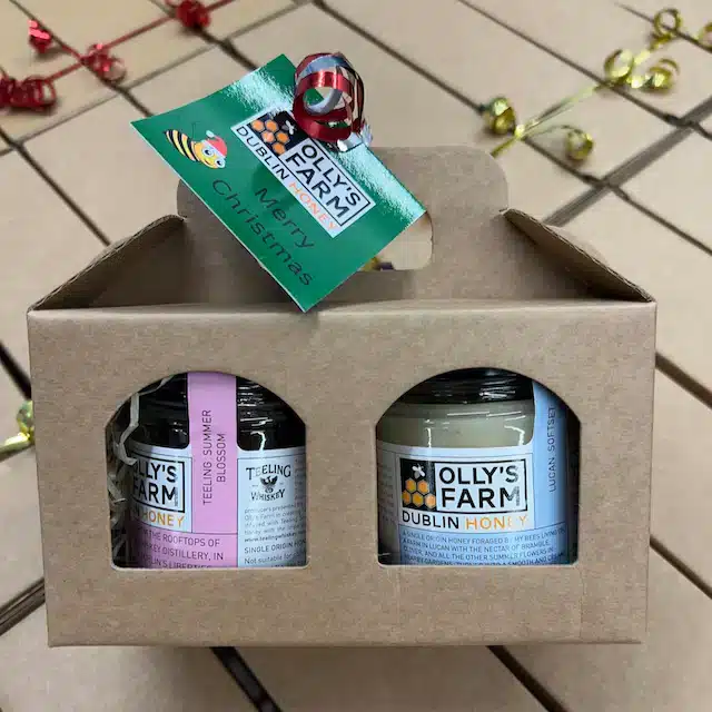 A gift box selection of a jar of blossom honey and a jar of softset honey.